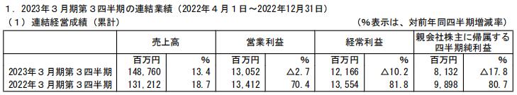 多美最新发布的2022年2、3、4季度累计(2022.4.1-2022.12.31)财报数据显示,销售额1487.6亿日元,同比增长13.4%;归属股东当期纯利润81.32亿日元,同比下降17.8%。受汇率及成本率影响,收益减少。