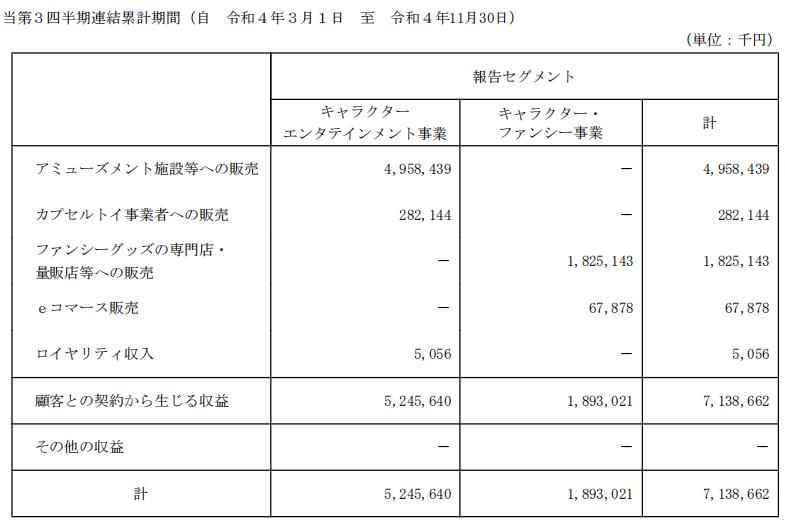 在游乐设施渠道销售额49.58亿日元,面向扭蛋店的销售额2.82亿日元,授权收入500万。