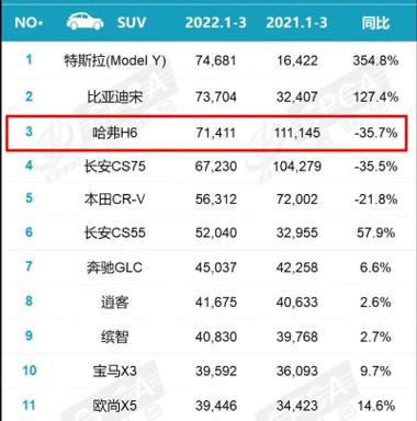 直接看数据,2022年一季度,哈弗H6从第一跌落至第三位,销量同比降幅达到35.7%。2022年的最后一个月,哈弗H6销量15963辆,同比下滑61.5%。曾经的销冠,如今已是英雄迟暮。