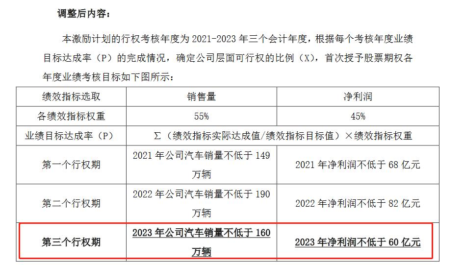 赶在2023年之前,长城汽车主动下调了今年的业绩目标。根据长城汽车发布《关于调整2021年限制性股票激励计划及2021年股票期权激励计划业绩考核目标》公告,将2023年的绩效指标由销量不低于280万辆、净利润不低于115亿元,下调为销量不低于160万辆、净利润不低于60亿元。