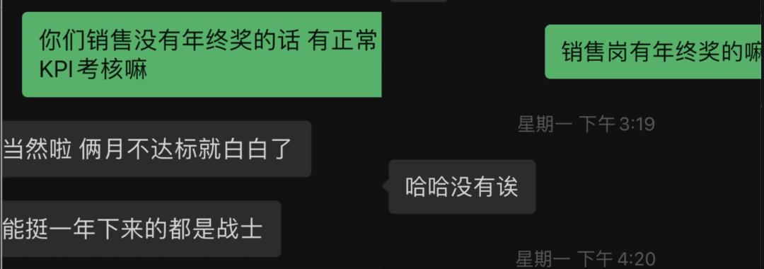 北京的理想销售林宇还向极派Daily补充道,“奖金没有,但是考核不会落下。销售团队也会有末位淘汰,2个月业绩不达标就‘再见’了,能坚持1年的都是‘战士’。”