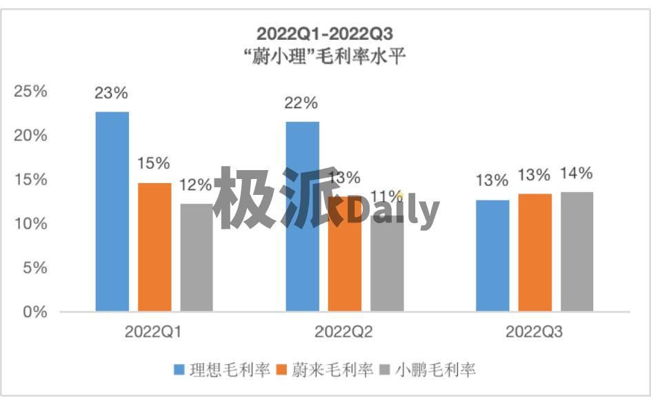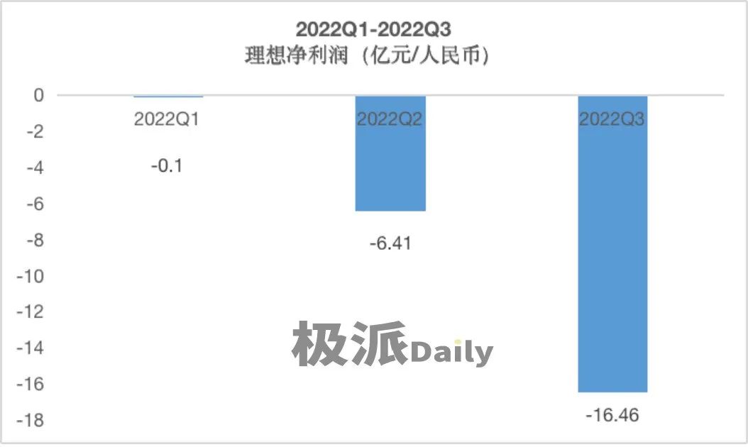 当季度,理想毛利率下滑至13%,较小鹏还少了一个点。而净亏损更是从2022年第二季度的6.41亿元环比扩大了157%至16.46亿元。