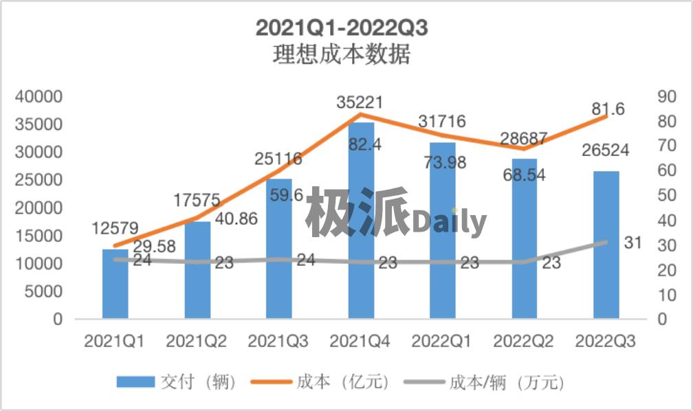 以理想每辆交付车的平均成本计算,在L9开启交付前,理想单车成本均在23-24万元,但是随着2022年第三季度理想L9的上市,单车成本瞬间环比上升35%至31万元。随之下降的自然是理想当季的盈利水平。
