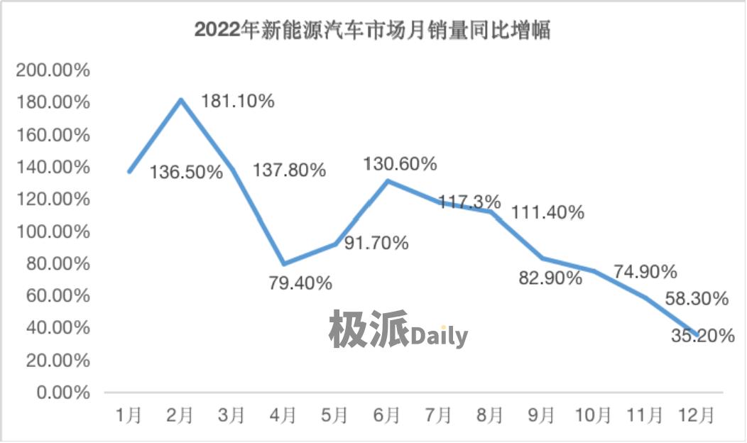 从乘联会公布的2022年全年新能源汽车销量数据不难看出,从2022年下半年开始,新能源汽车市场整体增速开始大幅度下滑,这不仅与消费水平有关,与年底新能源相关补贴的滑坡也有关系。