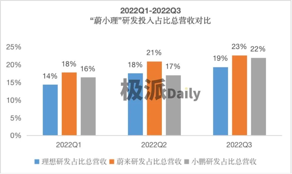 而理想的“抠门”也体现在其他数据上。举例来说,2022年前三个季度,理想研发投入和总营收的占比分别为14%、18%和19%,均低于蔚来和小鹏的研发投入占比。
