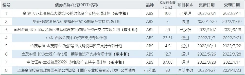该债券品种为ABS,拟发行金额100亿元,原始权益人为上海金茂投资管理集团有限公司,计划管理人为申万宏源证券有限公司。项目受理日期2023年2月14日,更新日期2023年2月21日。