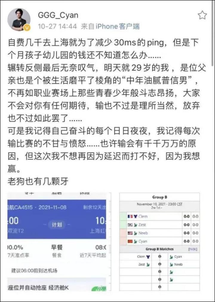 和李培楠相比,Cyan的年龄更符合大家对星际选手的想象。他今年30岁,是一名三岁孩子的父亲。2021年10月,他在Dreamhack冬季赛中国区预选赛中战胜了李培楠,这是他第一次打进季后赛。因为比赛在线上举办,为了减少网络延迟的影响,他决定自费去上海参加比赛。