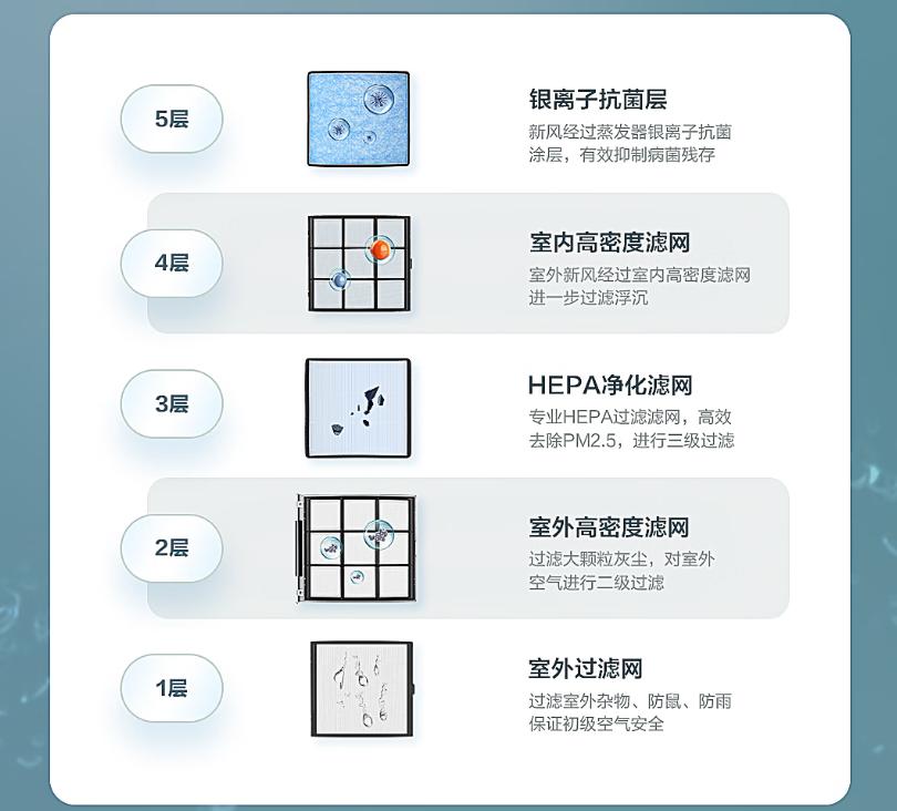 第二项需要关注的信息,是空调的除菌过滤功能。目前主流的新风空调都会内置HEPA滤网,能过滤粉尘颗粒、花粉等,PM 2.5净化率达98%以上。当然,现在很多产品都支持多重过滤,高端型号可能还会加入银离子抑菌、UVC紫外线杀菌等功能,这方面自然是除菌过滤效果越强越好,但相应的产品价格也越贵,可以根据实际预算去选择。