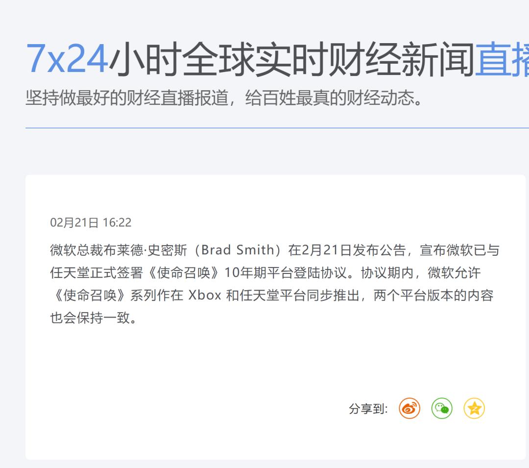 微软总裁宣布已经跟任天堂签了一份10年的合同,承诺以后让《使命召唤》上任天堂的平台,不搞主机独占。