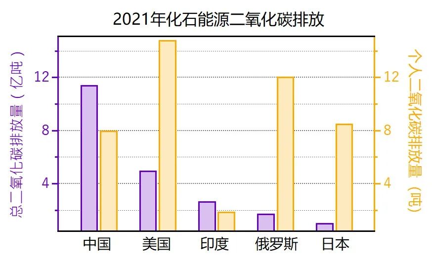 2021年化石能源二氧化碳排放总量前五的国家及其个人二氧化碳排放量比较 | 自制图,数据来源:Our World In Data(2)