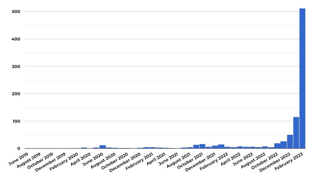 “目前投稿渠道已经关闭了,原因应该很好猜到吧。”Neil Clarke 在推特公开了一张图片,统计了近几年 Clarkesworld 每月因投稿抄袭文或用 AI 生成的文章而拉黑的作者数量: