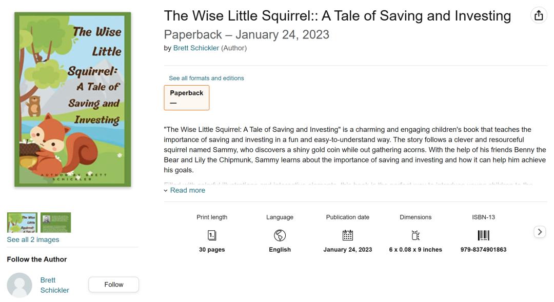 事实证明,他的猜想没错。仅用一些简单提示,Brett Schickler 就让 AI 生成了他想要的故事和插图,一本 30 页带插图的儿童电子书《聪明的小松鼠:储蓄与投资的故事》几小时内就完成了,并在今年 1 月以 2.99 美元的价格在亚马逊 Kindle 商店进行出售。