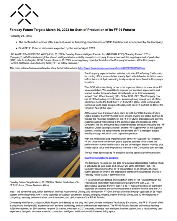 没想到,贾老板又把日子提前了!FaradayFuture官微发文宣布,未来将在投资人资金如期到位后,于2023年3月30日在位于加州汉福德的FF ieFactory California开始生产旗舰电动车产品FF 91 Futurist。