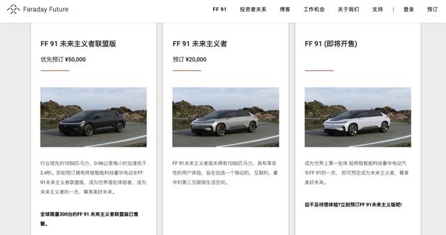 顺带一提,在去年7月,FF 91还曾正式启动预订,根据官网信息显示,FF91 未来主义者版联盟版已预订金额为5万元,目前全球限量300台,已全部售罄,只能通过后补方式排队。