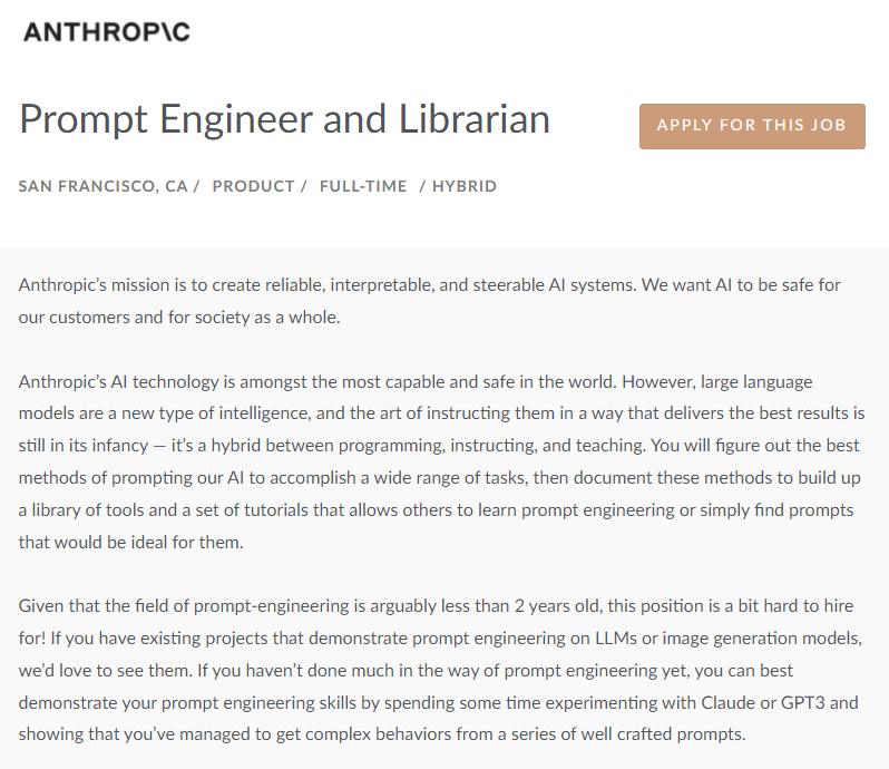 《每日经济新闻》记者注意到,已经有公司开出17万~33万美元的年薪来招聘提示工程师。招聘的公司正是OpenAI前研究副总裁自立门户的公司Anthropic。