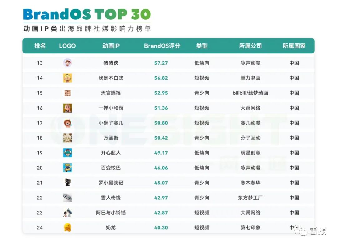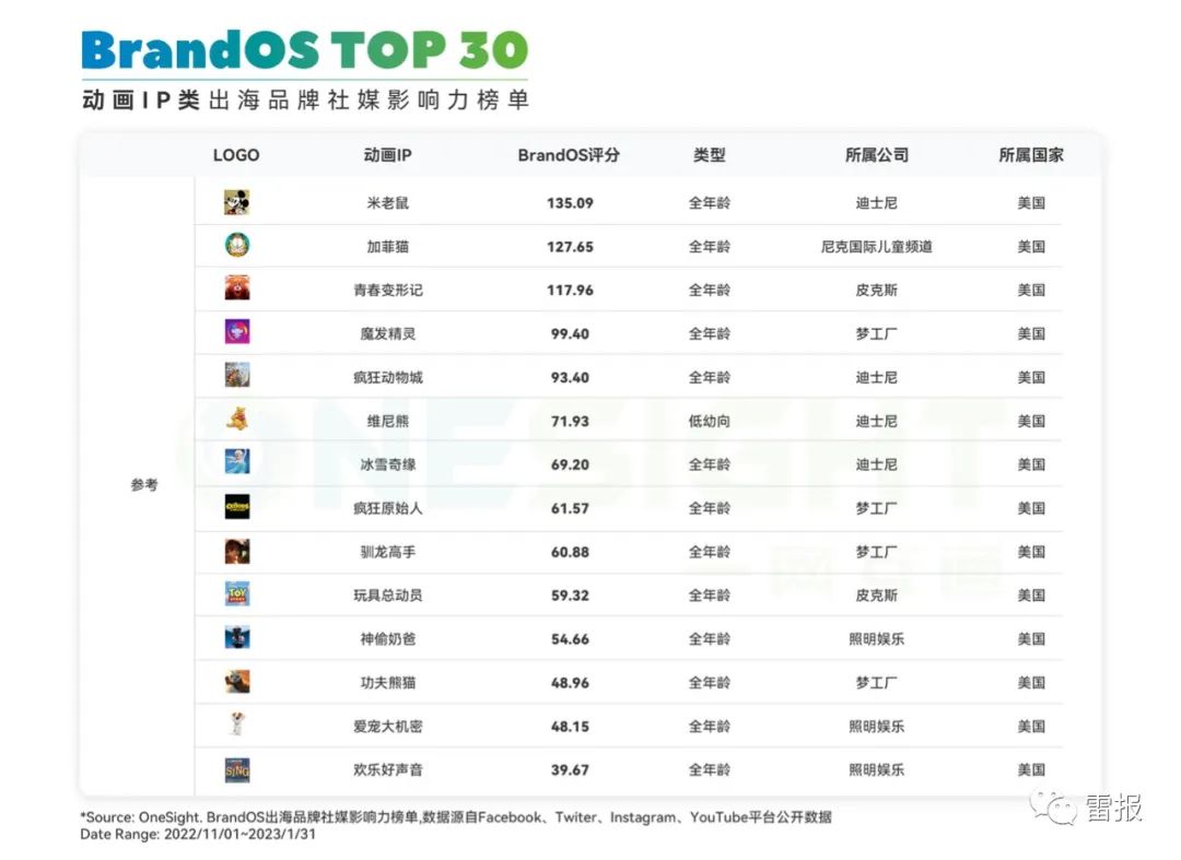 在撰写本报告【国际影响透析】部分时,BBI&雷报邀请全球社交媒体数据营销管理平台OneSight一网互通为本报告独家编制了涵盖视频平台、漫画平台、动画公司及动画IP四大类的出海品牌社交媒体影响力榜单。该榜单统计了2022.11.01-2023.01.31期间中国该领域主要品牌在Facebook、Twitter、Instagram和YouTube四大海外社交媒体的公开主页数据,使用分布取向统计方式,以最终得分进行排序。