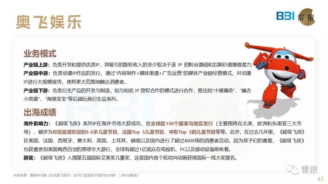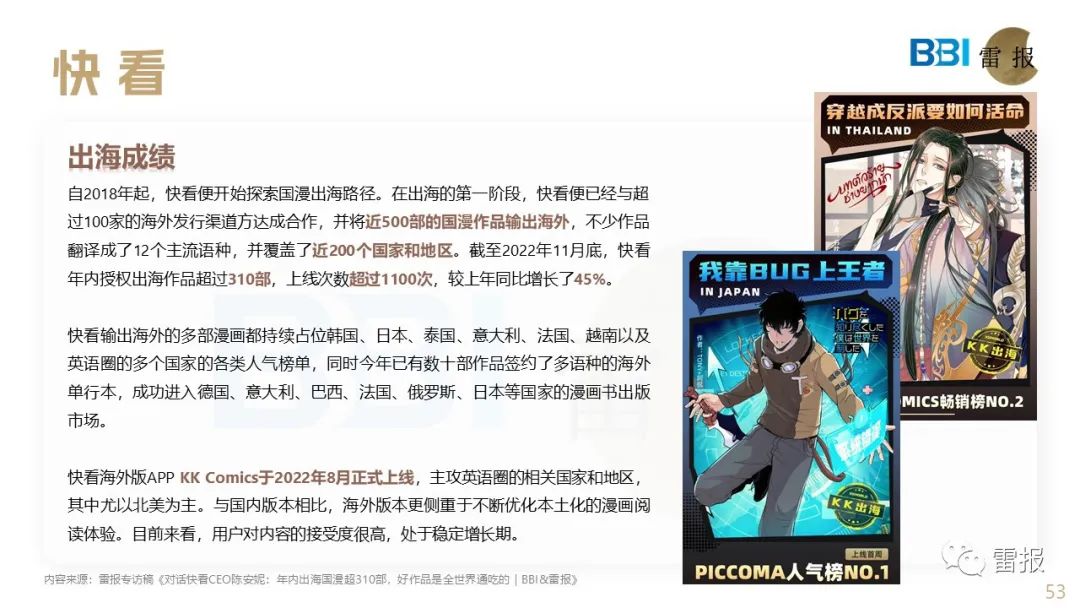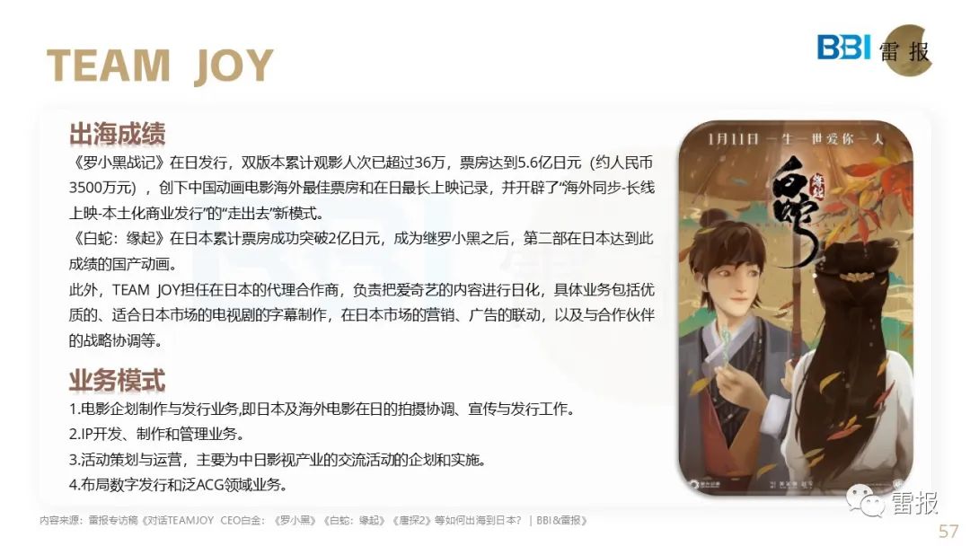 在本报告【典型企业】案例部分,BBI&雷报采访了奥飞娱乐快乐工作室团队负责人冯操、分子互动CEO徐博、快看创始人&CEO陈安妮及TEAM JOYCEO白金共四位行业内的知名公司高层,他们结合各自公司出海的典型案例分享了出海路上的经验心得,并同BBI&雷报深入交流了什么是好的中国故事、什么是中国动漫出海的关键、与日本动漫相比中国动漫的优劣是什么等话题内容。