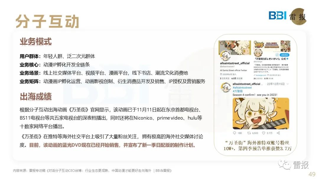 2月22日晚,由中国传媒大学经济与管理学院商务品牌战略研究所(Business Brand Institute,下文统一简称BBI)与雷报牵头,联合OneSight一网互通和广大大SocialPeta,共同发布《2023中国动漫出海前瞻报告》。