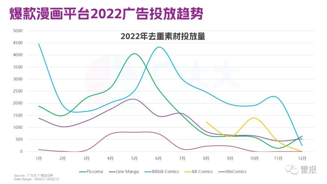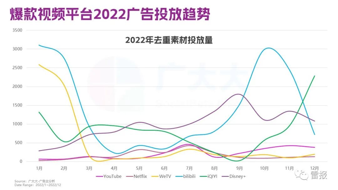 根据报告的【平台营销观察】部分,从广告投放趋势来看,视频平台方面,2022年国内视频平台的海外去重素材投放量较海外平台更高。其中,WeTV和B站的去重素材投放量达5000+,iQIYI则达到8000+,同期 YouTube和Netflix仅在1500上下。漫画平台方面,Bilibili Comics投放力度最大,最高投放量超过全球头部漫画平台Piccoma(11K),全年去重素材投放量达到17.5K;WeComics和22年8月上线的KK Comics整体投放量则较少,分别为1900+及2400+。