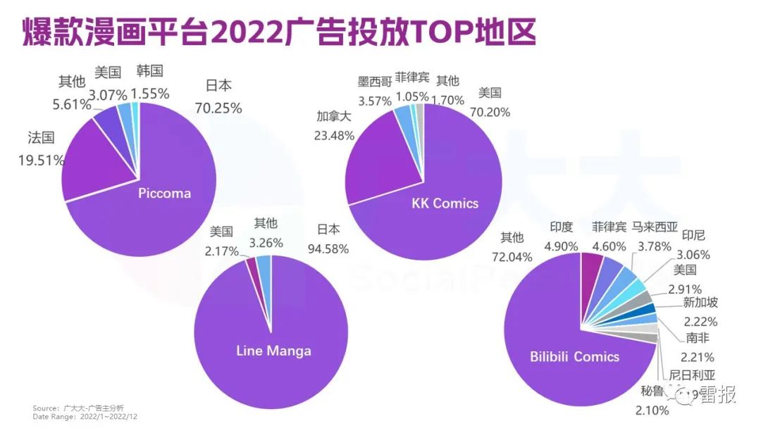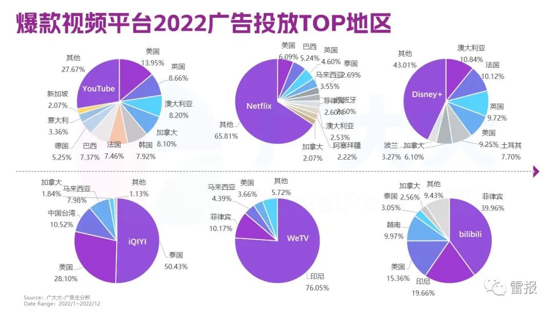 除了上述数据外,BBI&雷报还与全球领先广告营销平台广大大进行了合作,通过广大大对覆盖全球69个国家和地区的长期观察,分析了2022年国内部分视频及漫画平台在全球的营销侧重、绘制了广告投放趋势图,并与同领域的国际领先平台进行对比,侧面呈现出国内相关平台方的出海决心与力度。