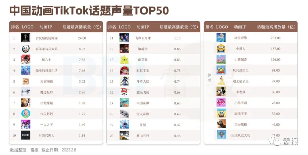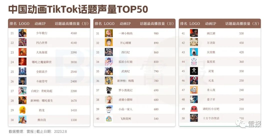海外社媒影响力榜单聚焦中国动画品牌通过自身内容和营销活动所产生的影响力,而作为全球粉丝文化聚集地之一的TikTok上的品牌话题播放量(涵盖品牌自身及粉丝创作的相关短视频)则提供了另一个新视角。为此,本报告统计了TikTok上中国动画单一话题最高播放量前50的动画IP。