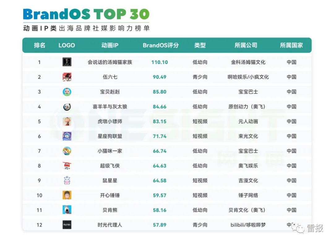 根据动画IP海外社媒影响力TOP30榜单显示,由金科汤姆猫文化于2017年收购海外公司Outfit7后所获的动画IP“会说话的汤姆猫家族”以110.10评分排名第一,“伍六七”和“宝贝赳赳”分别以90.49和85.80的评分排在第二、第三。另外,奥飞娱乐、咏声动漫、分子互动、哔哩哔哩及大禹网络等公司均有2个或以上IP进入TOP30榜单。