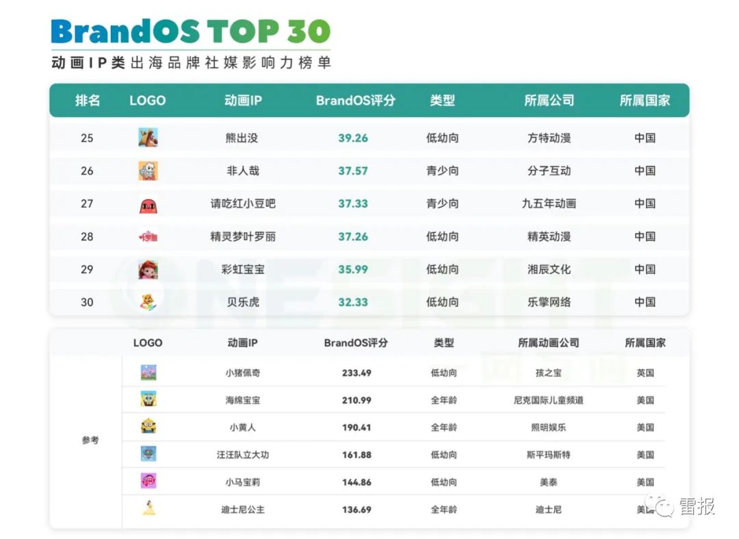 不过,和国际知名IP相比,国内动画IP的海外影响力仍处于较低水平。榜单显示,包括“小猪佩奇”、“海绵宝宝”、“小黄人”等多个IP的评分超过或者接近200,而中国动画IP中仅“会说话的汤姆猫家族”这一收购自海外公司的IP评分高于100。