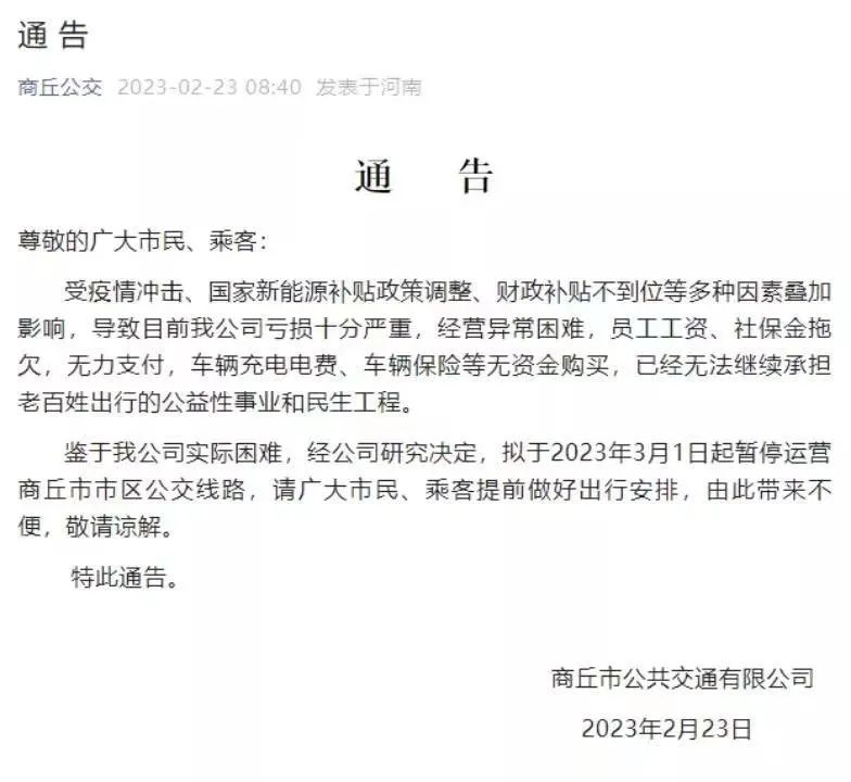 2023年2月23日上午,商丘公交发布一则通告称:公司亏损十分严重,经营异常困难,员工工资、社保金拖欠,无力支付,车辆充电电费、车辆保险等无资金购买,拟于2023年3月1日起暂停运营商丘市市区公交线路。