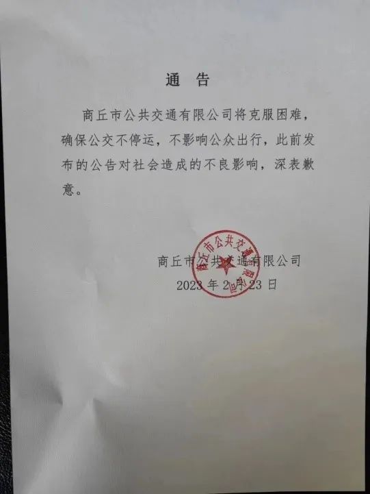 随后,商丘市委网信办发布情况说明,确认该公司经营困难,市政府工作组已进驻,将纾困解难,确保市区公共交通正常运营。2月23日中午,商丘市公共交通公司发布最新通告,称公司将克服困难,确保公交不停运。