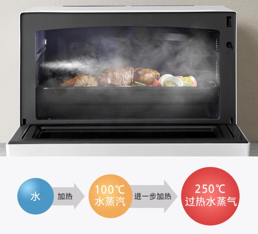 第二个值得注意的要点,那就是加热方式及温度。上文也提到传统蒸发盘加热方式很难达到过热水蒸气的温度要求,需要采用如蒸汽直喷之类的加热方式。但是,并非所有蒸汽直喷产品都是水波炉,蒸汽的温度才是关键。部分品牌的蒸烤一体机也采用如直喷大蒸汽、顶喷瀑布蒸汽之类的加热方式,产品名称可能还带上“水波炉”这样的标签,但并未提及蒸汽温度,算不上真正的水波炉。产品核心是温度高达250度以上的过热水蒸气,而不是直喷或顶喷等方式,千万要多留意别被糊弄了。