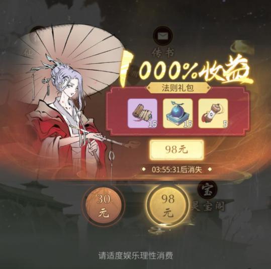 围绕这个概念,游戏使用了许多现实消费概念,在充值和刺激消费上玩出了花。例如将想卖的商品,价格上调30%,再打八折卖给玩家;大量利用9.9元,99元这样的数字模糊用户对于价格的潜意识判断,以及各种限时礼包和充值消费赠礼等多种操作。