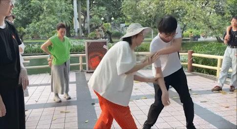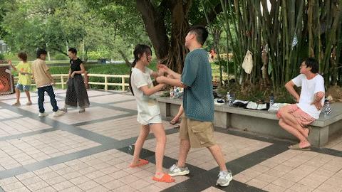 在晓港公园,偶尔,一旁跳广场舞的大叔大妈会好奇地凑近他们。过一阵就有路过的退休阿姨来学习怎么松身,还有练了十年太极拳的老阿姨也会来和冯俊华过几招,交流练功心得,“不管是谁,有没有练过,只要摸上手了,就可以在其中对话。”冯俊华说。