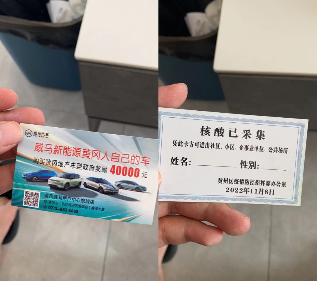 图注:去年,黄冈核酸采集出入证件的背面印上了威马的广告。