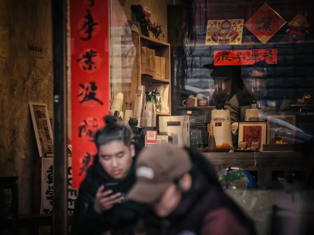 店里装修全靠大家“众筹”,快过年的时候,“铁客”们来喝个咖啡还要提东西,像“走人户”(重庆话)一样,对联都是隔壁火锅店老刘给写的;