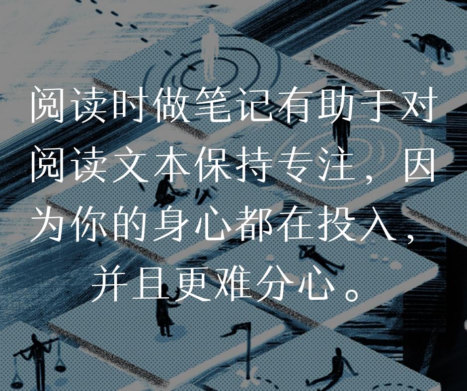 电子文本的可用性对于上述方法尤其有用[11]。电子文本可以插入有及时反馈的小测试,而这在纸质文本中是不可能的。除此之外,电子文本可以插入相关内容链接来示意或阐明文本中的知识。与此同时,阅读时记笔记可以帮助你专注于文本,因为你在主动地参与,也因此很难分心。在有关于看预录制视频课学习的研究中[12],边听课边做笔记被证明有助于理解课程,因为这可以减少神游。