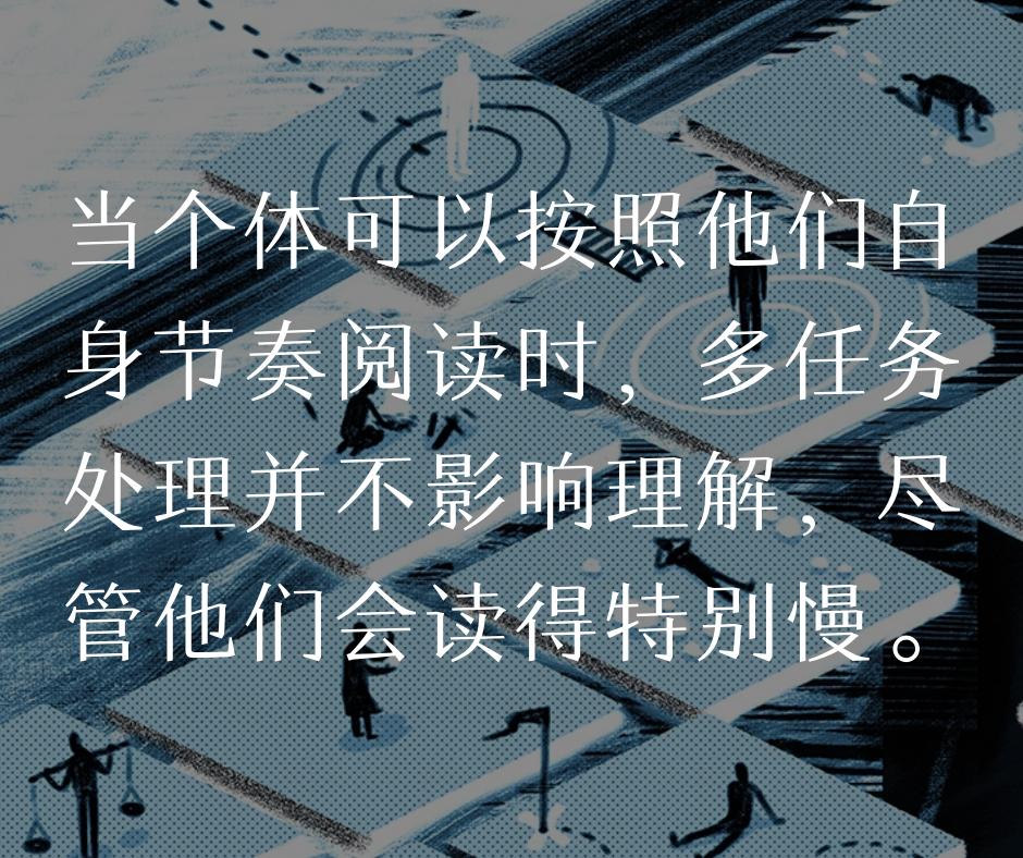 在我发表那篇元分析后,许多人来问我,多任务处理是否是导致纸质阅读的优势的因素之一,考虑到一个流行的观念是,相较于纸质件,读者在使用电子屏时更频繁地多任务处理。为了查明原因,我又开题了另一篇元分析[7],这一次的研究方向是多任务处理是如何、又于何种情况下影响阅读理解。根据包含了1686名被试的22项研究,我不出意料地发现,多任务处理对于阅读理解大体上是产生负面影响的。但是在不同情况下,多任务处理对阅读理解并不会以相同的方式产生影响。当个体可以按照自己的节奏阅读时,多任务处理并不影响他们的理解,尽管他们通常会读得更慢。所以,你可以同时处理多项任务,并且仍然能对你在读的内容有一个不错的理解——但要注意,要达到相同的理解水平,相比于专注阅读,这样的方式会占用你更长的时间。