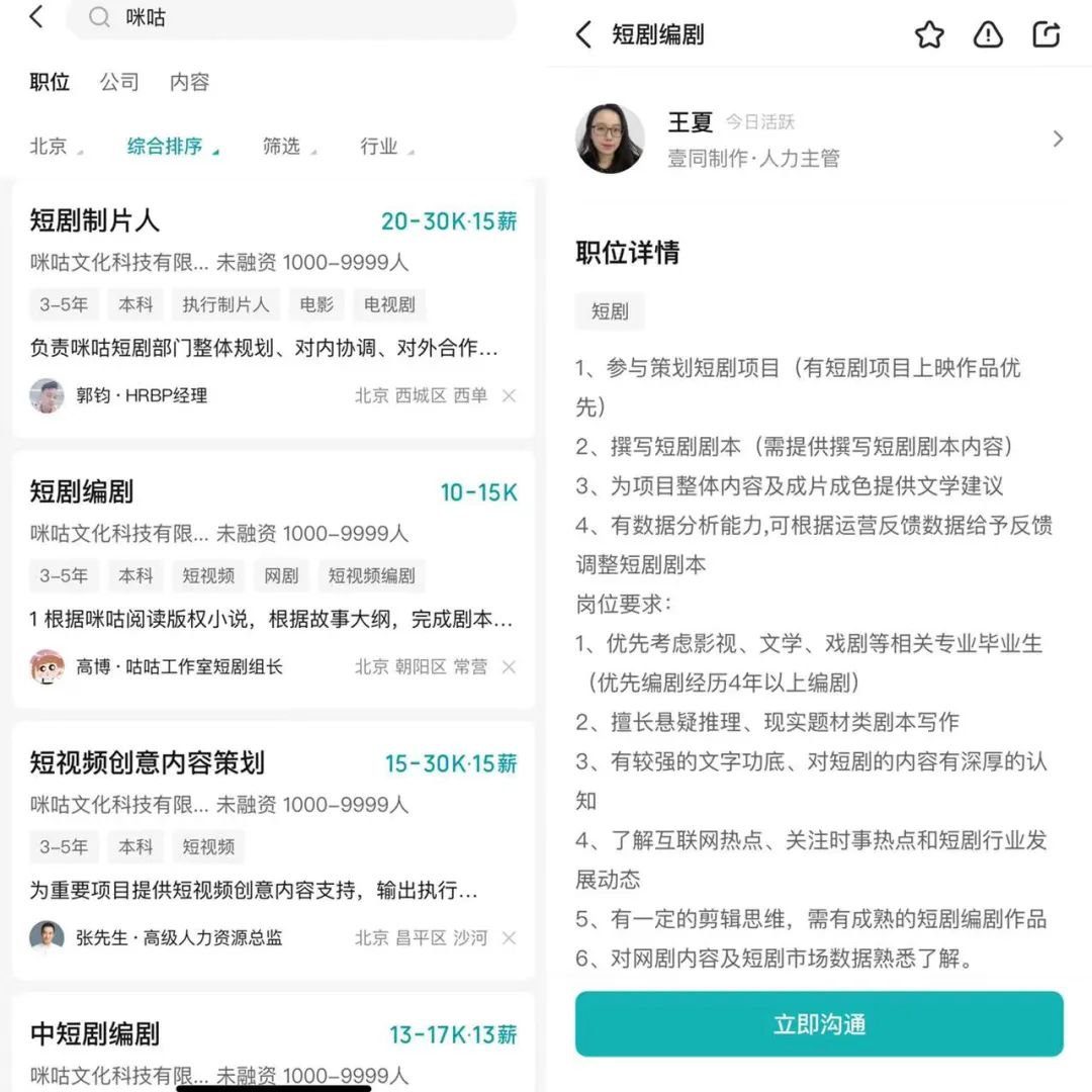 现在市面上的大部分影视策划找工作,都去了中剧、短剧、微短剧领域。这是目前影视策划里招聘的主流,连陈思诚的壹同制作都在招做短剧的人,咪咕视频这样的国企也开放了大量短剧职位。也就是说,不止腰部影视公司在中剧、短剧、微短剧领域讨口饭吃,头部公司也都在策略性布局这一领域。