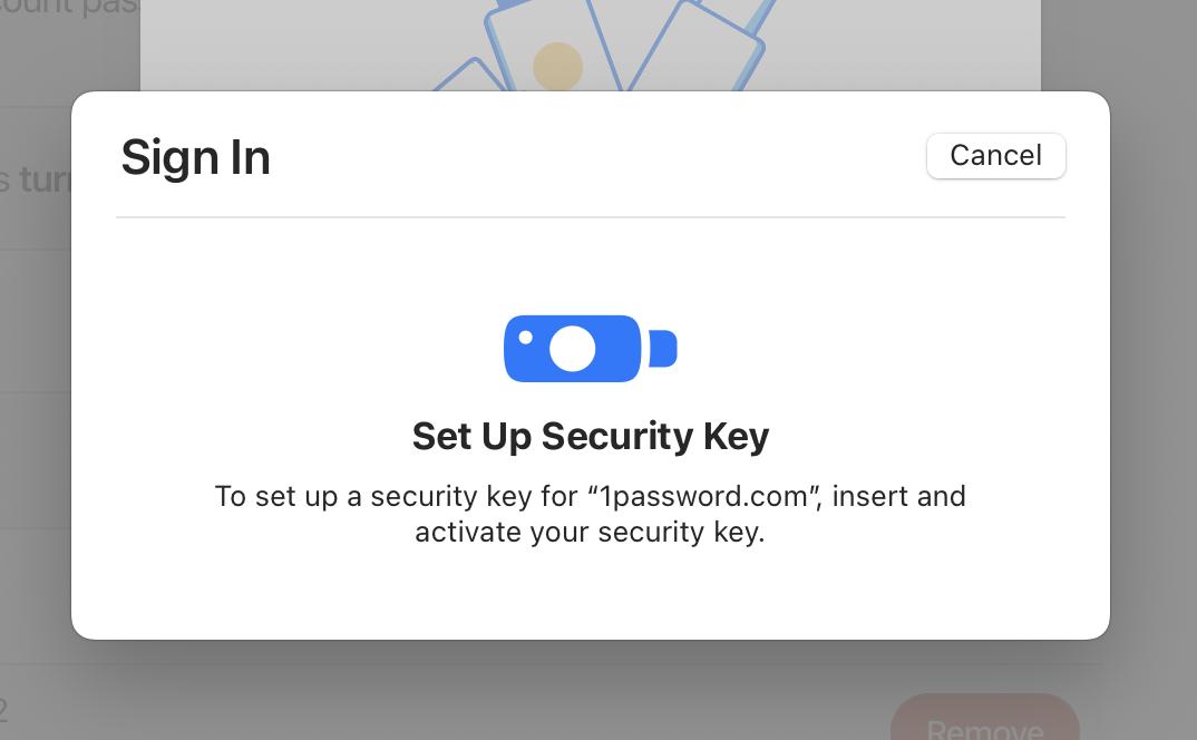 除了 FIDO2,U2F 则是另一个使用更为广泛的加密类型,不过正如前面所说的那样只能用于两步认证,如果你之前在添加通信密钥的时候见到了下面这样的画面,那就意味着这个服务和网站采用的是 U2F 加密类型。比如 1Password 目前就只能接受传统的安全密钥,又比如 Apple 在 16.3 中推出的 Apple ID 安全密钥机制也是如此。大家可以参阅 Yubikey 官网的 相关信息 以进一步确认兼容性。