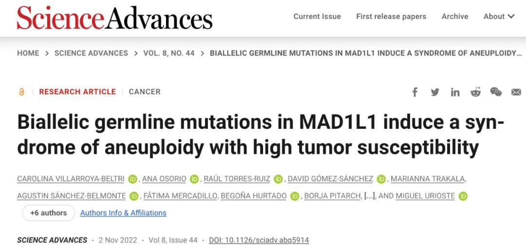 [1] Villarroya-Beltri C, Osorio A, Torres-Ruiz R, Gómez-Sánchez D, Trakala M, Sánchez-Belmonte A, Mercadillo F, Hurtado B, Pitarch B, Hernández-Núñez A, Gómez-Caturla A, Rueda D, Perea J, Rodríguez-Perales S, Malumbres M, Urioste M. Biallelic germline mutations in MAD1L1 induce a syndrome of aneuploidy with high tumor susceptibility. Sci Adv. 2022 Nov 4;8(44):eabq5914. doi: 10.1126/sciadv.abq5914