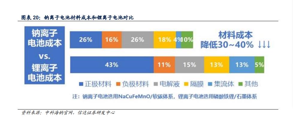 据浙商证券测算,钠电池目前材料成本约为0.427元/Wh,其中正极、负极和电解液的成本占比分别为30%、21%和23%,钠电池产业化后的材料成本将能达到0.25元/Wh,比磷酸铁锂电芯低35%左右。