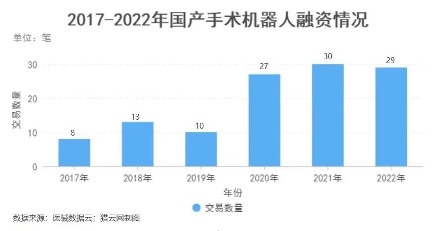 据医械数据云数据,去年手术机器人共发生29起融资事件,同比下降3.33%,是2019年以来首次的融资交易数据下滑。而在2021年几乎每个月,都有手术机器人公司宣布完成融资,过亿元融资事件超过10起。
