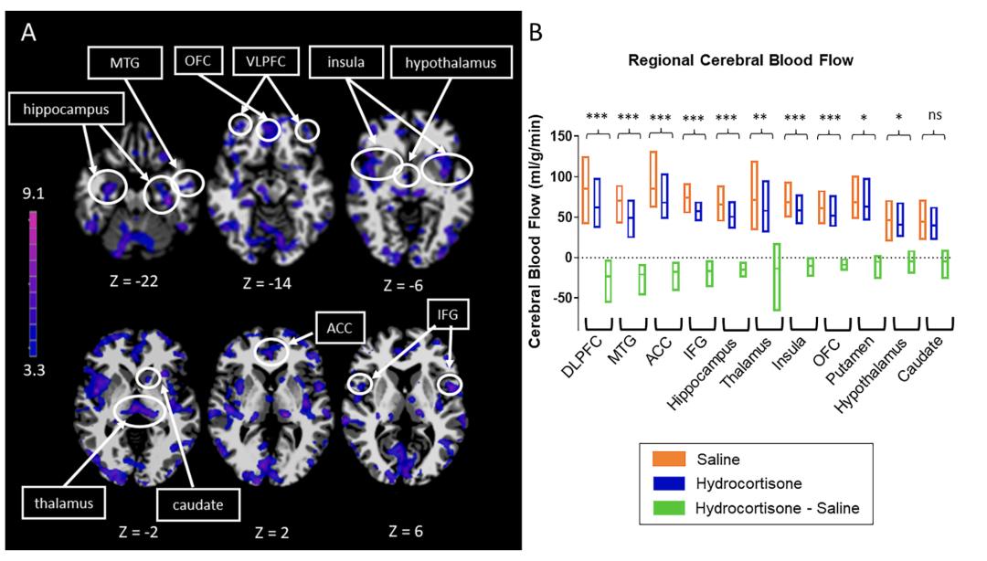 在我们的大脑中,前额叶等区域和食欲以及自制力有关,而注射皮质醇之后,这个领域的血流量减少了,更加不活跃了。