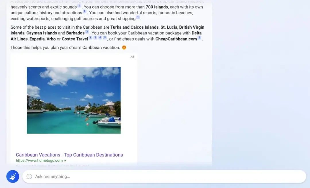 PCWorld 的编辑在测试的时候询问了一些加勒比海度假的信息。必应在回答了基本的内容后,立刻弹出了一个广告。如果你问它如何更换笔记本电脑的内容,它也会很快反应过来给你推购物链接,而不是给出更低成本的方法。