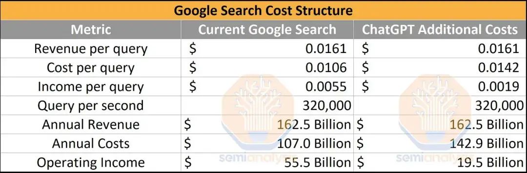 Semi Analysis 则真金白银算了下这种对话搜索的昂贵。 它们根据硬件成本进行推算,认为语言模型单次对话成本可能是 0.36 美分。Open AI 曾公开表示 ChatGPT 的单次对话成本在几美分只有,也在侧面隐隐验证了这个数据——就算不精确,那也很接近。