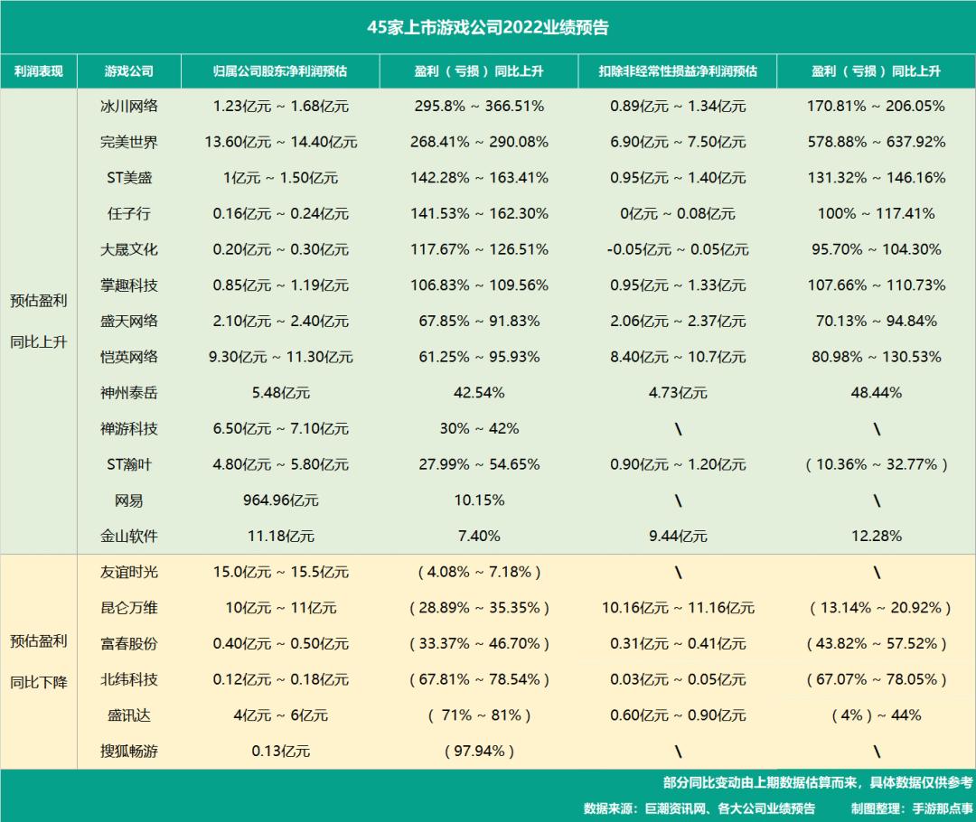 这么看来,似乎游戏厂商们在2022年交出的这份业绩预告,更像是对旧时代的一次告别。而值得一提的是,此次统计的财务数据只是上市游戏公司的业绩预估,企业具体的财务信息将会在不久后的企业年报中披露,届时手游那点事也将会持续跟踪相关公司的财务报告,发布相应的分析解读。