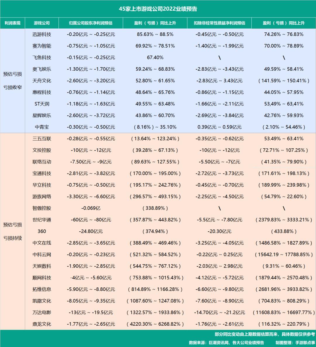 为了在年报尽出之前观察一下2022年游戏厂商到底过得怎么样,多少企业实行降本增效?又有多少企业蓄势待发?为此,手游那点事整理共45家游戏上市公司的2022业绩预告(包括已出的年度财报)。统计得出:接近6成的公司在2022年出现亏损,也就是说,这45家游戏公司仅19家有盈利。