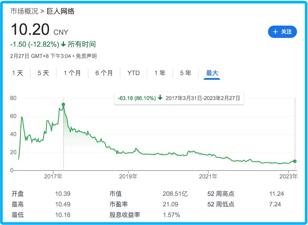 市场对这家老牌游戏厂商的信任也明显发生动摇,2月27日,巨人网络收报10.2元/股,市值约208亿元,较股价高点已蒸发超八成。
