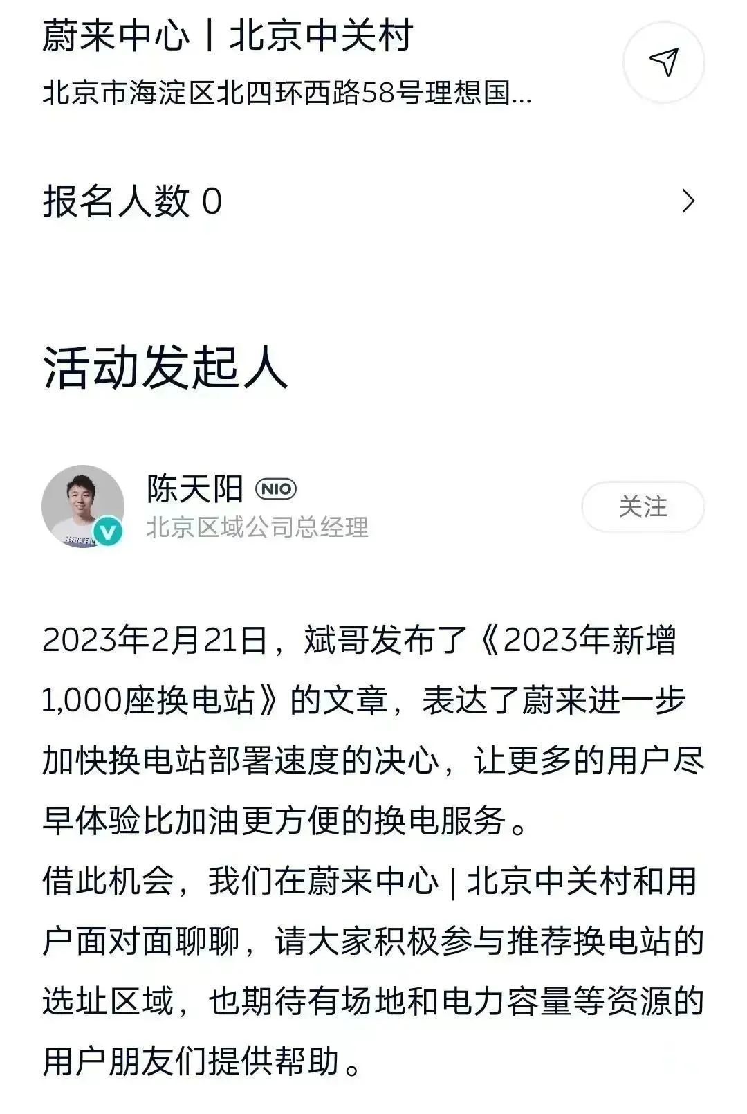 或许,这才是蔚来在宣布“千站计划”后,紧接着在全国相继举办几十场用户见面会的原因。在每个城市的活动报名页面中,活动发起人特地写明了蔚来的诉求“请大家积极参与推荐换电站的选址区域,也期待有场地和电力容量等资源的用户朋友们提供帮助” 。