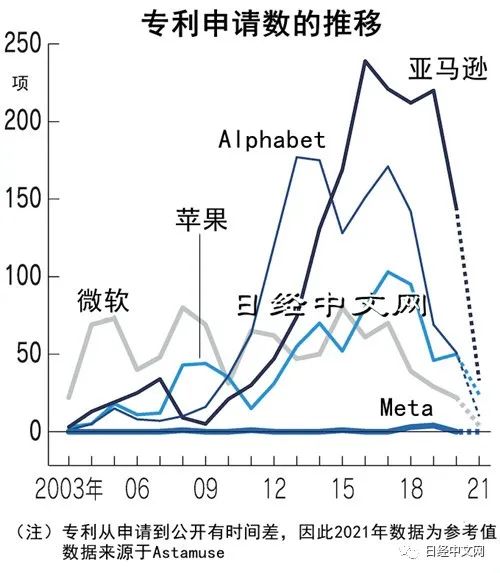 为了调查大型科技企业的知识产权实力,日本经济新闻(中文版:日经中文网)的专业媒体“NIKKEI Mobility”与Astamuse公司合作,分析了Alphabet(谷歌母公司)等被称为“GAFAM”的5家公司2003年以后申请并公开的专利,时间跨度约20年。
