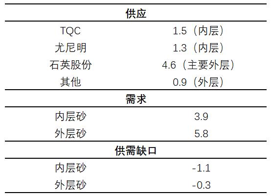 目前可以明确的是,如果内层砂供给仅来源于TQC和尤尼明的话。2023年仅内层砂就会产生1.1万吨的缺口,而外层砂缺口则只有0.3万吨。